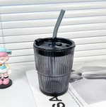Une tasse en verre à rayures créatives, avec couvercle et paille, alliant style, polyvalence et confort d’utilisation.